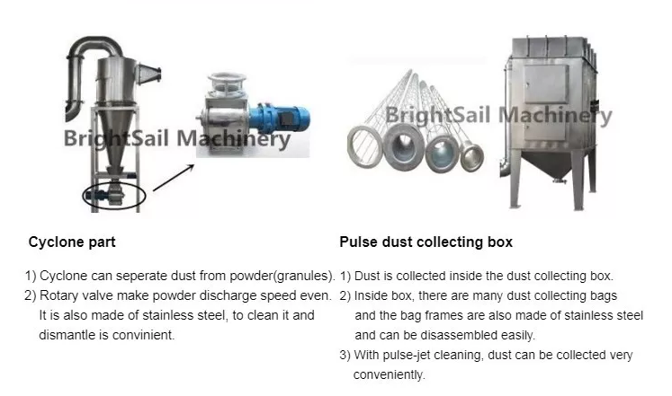 The machine is made up of crusher part, cyclone, dust collecting box, blower and control box.It uses fixed plate and the relative